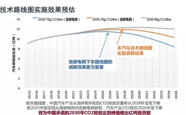 如果2030年按本次路線圖提出的75g/km、新能源汽車占銷量40%以上測算,我國汽車產(chǎn)業(yè)從油井到車輪的CO2排放總量將從2028年就開始呈現(xiàn)下降趨勢,如果2025年前我國電網(wǎng)能實現(xiàn)從高碳電網(wǎng)向低碳電網(wǎng)的轉(zhuǎn)型,汽車產(chǎn)業(yè)從油井到車輪的CO2排放總量將在2026年之后就開始明顯下降。