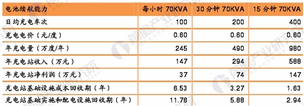 總體來看,單個充電站基礎(chǔ)設(shè)施和配電設(shè)施投資額不算大,如果電池續(xù)航能力能夠達(dá)到半小時70KVA以上,充電站成本回收期能控制在6年以內(nèi),單個充電站基礎(chǔ)設(shè)施和配電設(shè)施投資在430萬元左右。