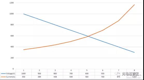 目前主流的動力電池系統一般是在100串左右,標稱電壓300~400V區(qū)間(比亞迪的技術路線串聯更多一點,在600V左右)。下圖是實現350kw大功率充電下的電池電壓和電流關系,當電池電壓在400V時,電流可達875A。大電流意味著必須增加充電線纜的載流量和截面積,加粗的線纜勢必增加車輛重量、減少空間,提升布置難度,同時線纜的壽命將大幅衰減。所以動力電池系統升壓勢在必行,使電壓達到900V,電流控制在400A以內。由此電機側也根據需要做進一步的調整。