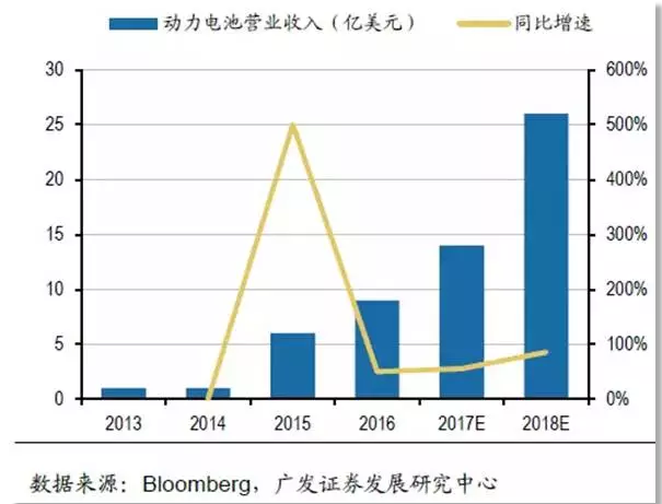 對(duì)比往年數(shù)據(jù),今年LG化學(xué)動(dòng)力電池出貨量及營(yíng)業(yè)收入穩(wěn)中有升。有研究機(jī)構(gòu)預(yù)測(cè),其在2018年將迎來較大增長(zhǎng),且看下圖: