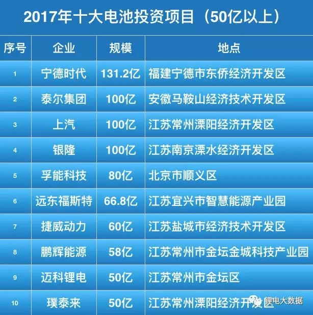 50億起步!2017年十大鋰電池投資項(xiàng)目盤點(diǎn)!