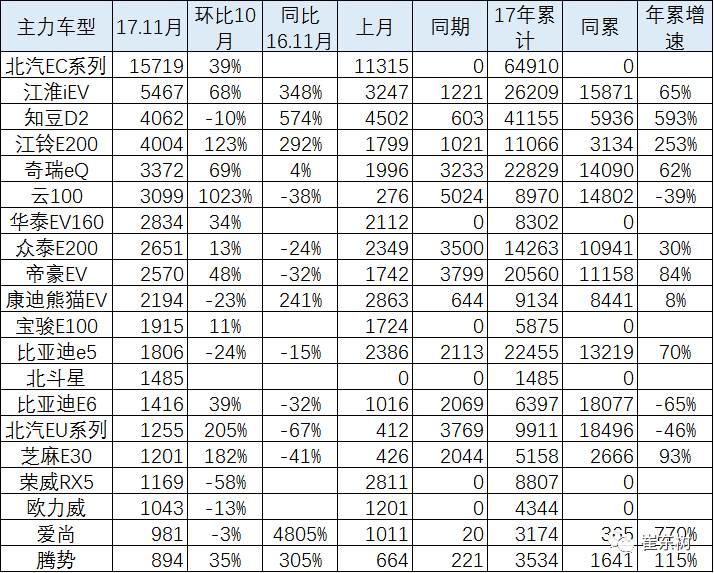 總體新能源車(chē)中,17年新能源銷(xiāo)量是比亞迪絕對(duì)領(lǐng)先,但10-11月的北汽新能源超越比亞迪成為銷(xiāo)量領(lǐng)軍,而且單一車(chē)型也超過(guò)比亞迪總量臺(tái)。上汽乘用車(chē)的環(huán)比表現(xiàn)突出,而長(zhǎng)安汽車(chē)和五菱汽車(chē)的表現(xiàn)也很好,成為新能源的主力廠家。