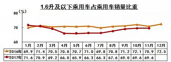 按照不同的購(gòu)置稅率來(lái)看,小排量市場(chǎng)銷(xiāo)量可以分為兩大階段。2017年全年購(gòu)置稅率為7.5%,根據(jù)目前中汽協(xié)公布的數(shù)據(jù)顯示,2017年前11月,1.6升及以下乘用車(chē)?yán)塾?jì)銷(xiāo)售1513.7萬(wàn)輛,同比下降2%,占乘用車(chē)銷(xiāo)量比重為68.5%,同比下降2.7個(gè)百分點(diǎn)。