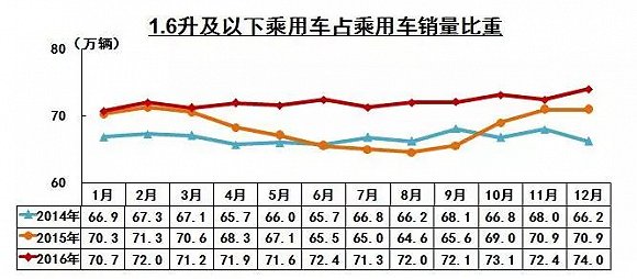 2017年1.6升及以下排量乘用車(chē)購(gòu)置稅優(yōu)惠政策對(duì)于車(chē)市整體刺激有限。但根據(jù)中汽協(xié)2016年銷(xiāo)量數(shù)據(jù)來(lái)看,2016年1.6升及以下排量乘用車(chē)銷(xiāo)售1760.7萬(wàn)輛,同比增長(zhǎng)21.4%,高于乘用車(chē)總體增速6.5個(gè)百分點(diǎn),占乘用車(chē)銷(xiāo)量比重為72.2%,比上年同期提高3.6個(gè)百分點(diǎn)。對(duì)乘用車(chē)銷(xiāo)量的貢獻(xiàn)度為97.9%。整體銷(xiāo)量走勢(shì)均高于2015年同期銷(xiāo)量,可以說(shuō)購(gòu)置稅的優(yōu)惠刺激性作用在2016年全年發(fā)揮明顯。這在某種程度上提前透支2017年小排量乘用車(chē)的銷(xiāo)量。