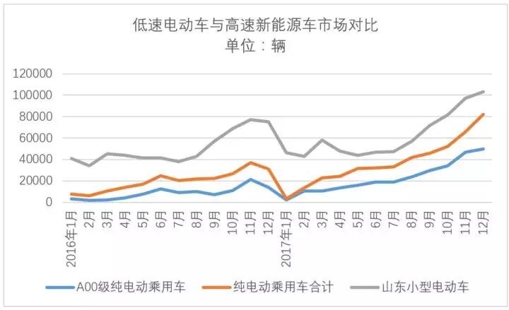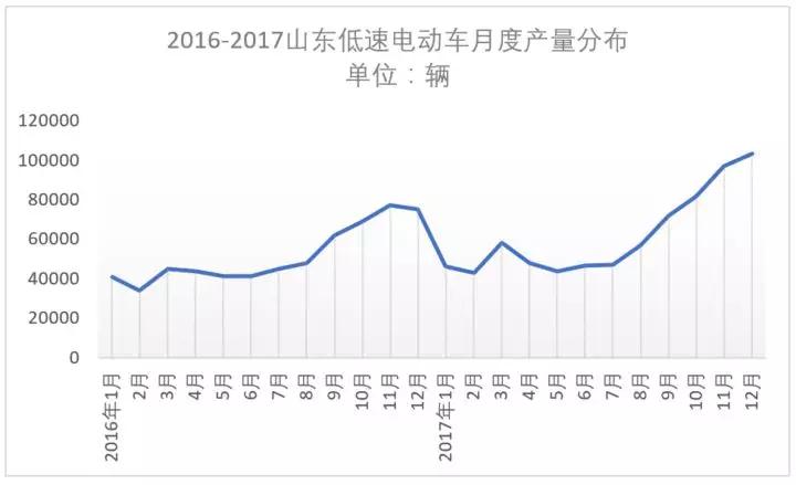 就單月產(chǎn)出水平看,山東低速電動車月度產(chǎn)量最高依然是12月,據(jù)山東省汽車行業(yè)協(xié)會統(tǒng)計,12月份山東生產(chǎn)低速電動車103298輛,同比2016年同期75324輛增長27.1%,環(huán)比11月增長6.4%。值得一提的是,這也是低速電動車單月產(chǎn)量首次躍入10萬輛的水平,2017年第四季度的單月產(chǎn)銷不斷創(chuàng)造新的高紀錄。