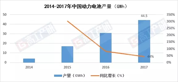 高工產(chǎn)研鋰電研究所(GGII)調(diào)研數(shù)據(jù)顯示,2017年中國動(dòng)力電池產(chǎn)量44.5GWh,同比增長44%。