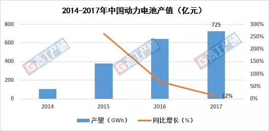 高工產(chǎn)研鋰電研究所(GGII)調(diào)研數(shù)據(jù)顯示,2017年中國動(dòng)力電池產(chǎn)量44 5GWh,同比增長44%。2017年中國動(dòng)力電池產(chǎn)值725億元,同比增長12%。動(dòng)力