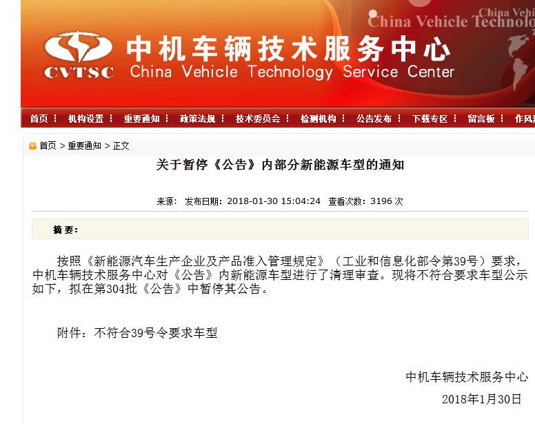 1月30日,中機(jī)中心網(wǎng)站發(fā)布關(guān)于暫停《公告》內(nèi)部分新能源車型的通知。通知指出,按照《新能源汽車生產(chǎn)企業(yè)及產(chǎn)品準(zhǔn)入管理規(guī)定》(工業(yè)和信