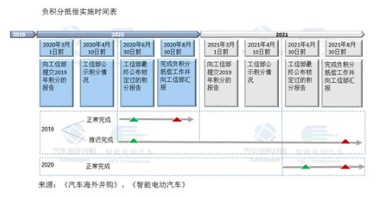 根據(jù)雙積分政策的實(shí)施時(shí)間表,雖然該政策的生效時(shí)間是2018年4月1日,但因?yàn)檎咭髲?019年度開(kāi)始才設(shè)定新能源汽車(chē)的積分比例要求(10%)。而正常情況下,積分考核又是建立在上一年積分核算統(tǒng)計(jì)的基礎(chǔ)上進(jìn)行的,因此,對(duì)于2019年的新能源積分考核,實(shí)際要等到2020年的6月30日工信部等五部門(mén)聯(lián)合發(fā)布經(jīng)核實(shí)的2019年積分核算情況報(bào)告后才開(kāi)始。2019年積分核算情況報(bào)告發(fā)布后的60天內(nèi),有負(fù)積分的企業(yè)就需要完成積分的交易了。