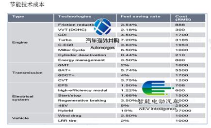 對(duì)于降低油耗的節(jié)能技術(shù),近年來(lái)行業(yè)通常采用減小發(fā)動(dòng)機(jī)排量、降低車(chē)身重量、采用渦輪增壓技術(shù)、節(jié)油變速箱、48V等技術(shù)措施。依據(jù)相關(guān)行業(yè)機(jī)構(gòu)的估算,渦輪增壓技術(shù)能夠幫助降低7%的油耗,需要增加的成本為3000元左右,而48V節(jié)油效果估算為5%左右,需要增加的成本為2500元左右。