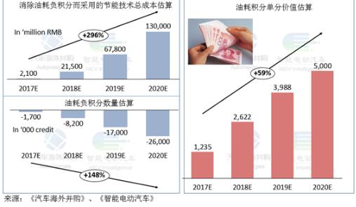 由此推算,為消除單個(gè)油耗負(fù)積分需要投入的金額從2017年的1200元左右將猛增到2020年的5000元左右,年復(fù)合增產(chǎn)率為59%。