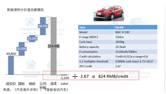 以2017年純電動(dòng)汽車(chē)的銷(xiāo)售冠軍北汽EC180為例,新生產(chǎn)的新能源汽車(chē)的積分價(jià)值相當(dāng)于在銷(xiāo)售汽車(chē)之外的額外期待收益,通常用汽車(chē)的成交價(jià)+補(bǔ)貼政策紅利-總成本(成本基于調(diào)研數(shù)據(jù)粗略估算,許多新能源汽車(chē)的生產(chǎn)仍然處于虧損狀態(tài),沒(méi)有了補(bǔ)貼將虧損更多),有大概2200元的差距。根據(jù)EC180的技術(shù)參數(shù)核算后的單車(chē)新能源積分為2.67分(不滿足1.2倍積分的電耗門(mén)檻10.57kwh/100km),單個(gè)新能源積分的價(jià)值估算為824元。