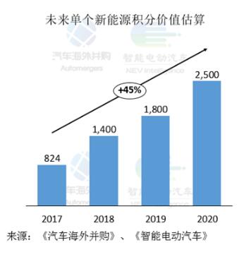 單個(gè)新能源積分價(jià)值1000元左右只是基于目前的情況進(jìn)行推演的結(jié)果。隨著2019年雙積分政策開(kāi)始考核、補(bǔ)貼加速退坡以及由各種技術(shù)門(mén)檻提高帶來(lái)的總成本的大幅提升,預(yù)計(jì)未來(lái)單個(gè)新能源積分的價(jià)值將持續(xù)提高,粗略估計(jì)從目前的不足一千元逐漸上漲到2500元左右。