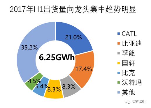 同時(shí),大型電池廠商為提高市場(chǎng)份額,降低風(fēng)險(xiǎn),正在積極與車企合作,也逐漸導(dǎo)致了多寡頭的格局。除了比亞迪采用自配套模式外,車企與電池廠商多以合資或外購(gòu)模式進(jìn)行綁定。2017年電池的出貨量較2016年,也逐漸向龍頭集中,排名前六的電池廠商總的出貨量占比超過(guò)60%。