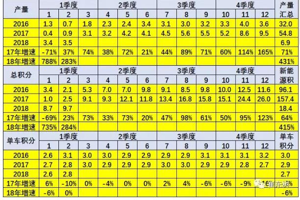 18年1-2月的新能源車生產(chǎn)6.9萬臺,形成新能源積分18萬分,每臺乘用車平均2.7分,較17年的2.9分下降6%。18年1-2月新能源乘用車產(chǎn)量6.9萬臺,較2017年增長431%,而新能源積分達到18.4萬分,較16年同期增長415%。