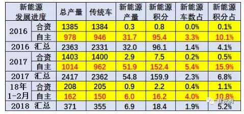 17年1-12月的新能源車銷量占比2.3%,較16年全年的1.4%有了大幅改善提升,18年的1-2月新能源車銷量占達到1.9%。其中合資企業(yè)的改善較小,18年自主產(chǎn)量6萬臺,表現(xiàn)較強。