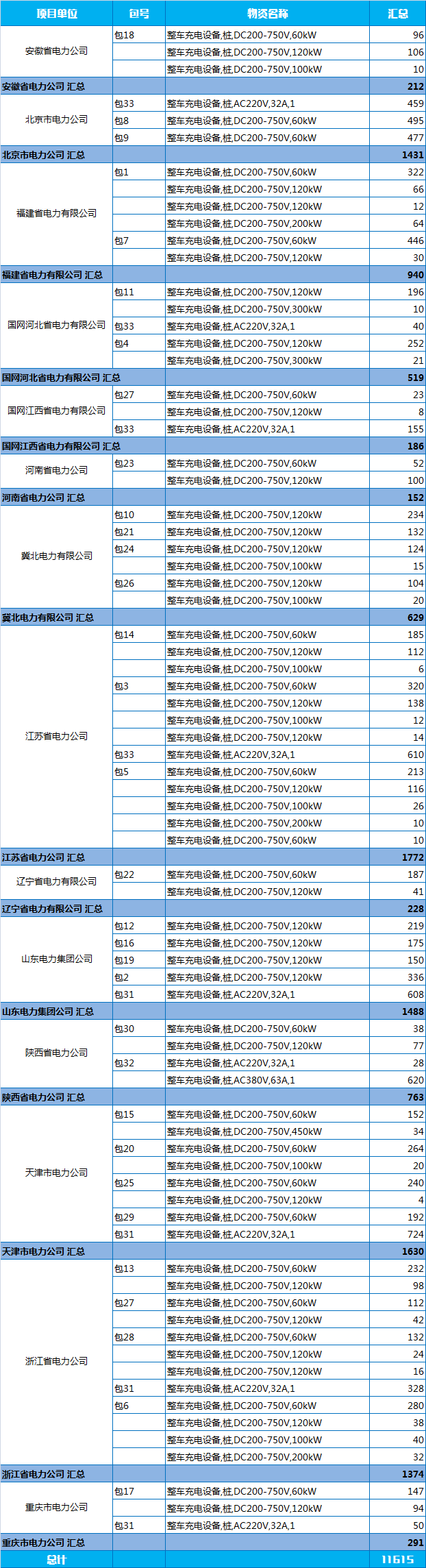 另,值得注意的一點(diǎn)是,此次招標(biāo)中出現(xiàn)了450kW的大功率充電設(shè)備,為天津電力公司招標(biāo),包號(15)整車充電設(shè)備,樁,DC200-750V,450kW,數(shù)量為34臺。