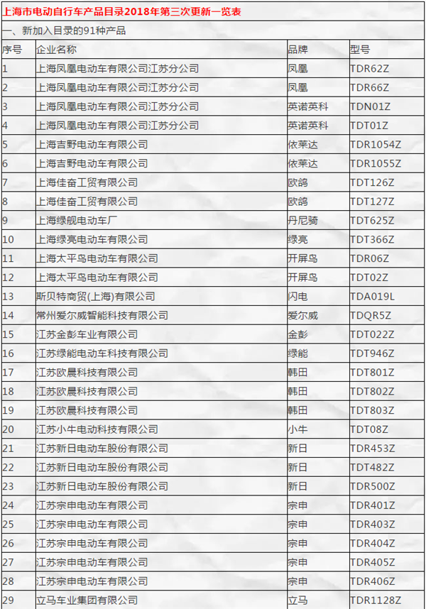 近期,上海市經(jīng)濟(jì)和信息化委員會下達(dá)了關(guān)于2018年第三次更新《上海電動自行車產(chǎn)品目錄》的通知,該目錄又上海市質(zhì)量技監(jiān)局、工商局、公安局、環(huán)保局及行業(yè)協(xié)會共同編制,新增了91個車型,并降某品牌車型從目錄中刪除!