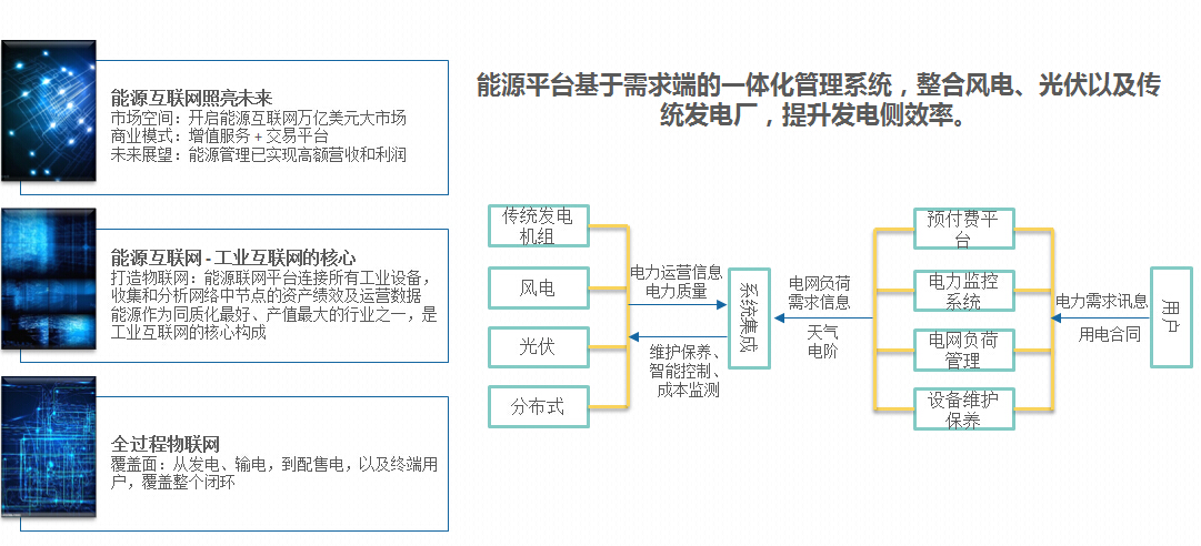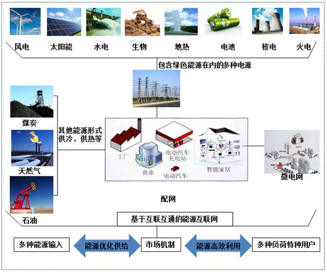 “能源互聯(lián)網(wǎng)”是綜合運用先進的電力電子技術(shù), 信息技術(shù)和智能管理技術(shù), 將大量由分布式能量采集裝置, 分布式能量儲存裝置和各種類型負載構(gòu)成的新型電力網(wǎng)絡、石油網(wǎng)絡、天然氣網(wǎng)絡等能源節(jié)點互聯(lián)起來, 以實現(xiàn)能量雙向流動的能量對等交換與共享網(wǎng)絡。并通過整合運行數(shù)據(jù)、天氣數(shù)據(jù)、氣象數(shù)據(jù)、電網(wǎng)數(shù)據(jù)、電力市場數(shù)據(jù)等,進行大數(shù)據(jù)分析、負荷預測、發(fā)電預測、機器學習,打通并優(yōu)化能源生產(chǎn)和能源消費端的運作效率,需求和供應將可以進行隨時的動態(tài)調(diào)整。