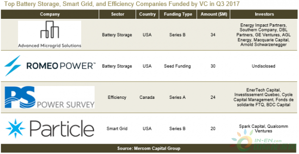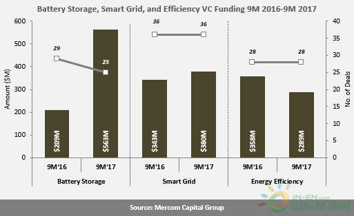 Mercom資本發(fā)布第三季度報(bào)告稱,2017年1-9月,全球智能電網(wǎng)、電池儲能和能效企業(yè)獲得風(fēng)投資金12億美元,同比增長32%。