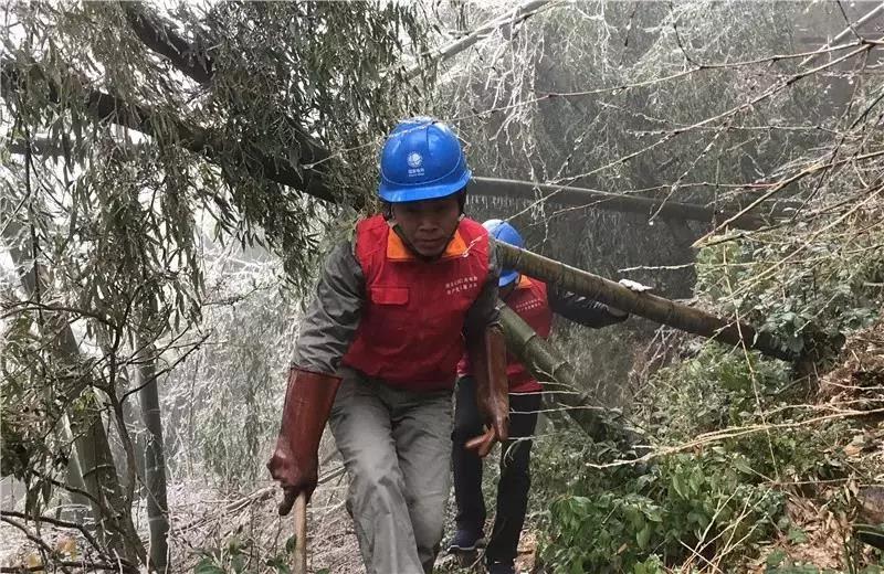 12月10日,江西上饒市上饒供電公司員工黃大金、胡高海在10千伏前程線190號(hào)桿附近清除被冰棱壓倒的樹障。(劉小珍)