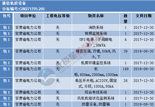 國網(wǎng)甘肅省電力公司2017年第五次物資招標(biāo)采購招標(biāo)公告,此次招標(biāo)涉及的物資有:35kV 變壓器、端子箱、瓷柱式交流斷路器、智能變電站測控及在線監(jiān)測系統(tǒng)、繼電保護(hù)及自動裝置、智能變電站電源系統(tǒng)、電源系統(tǒng)、軟