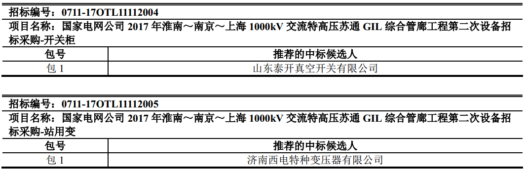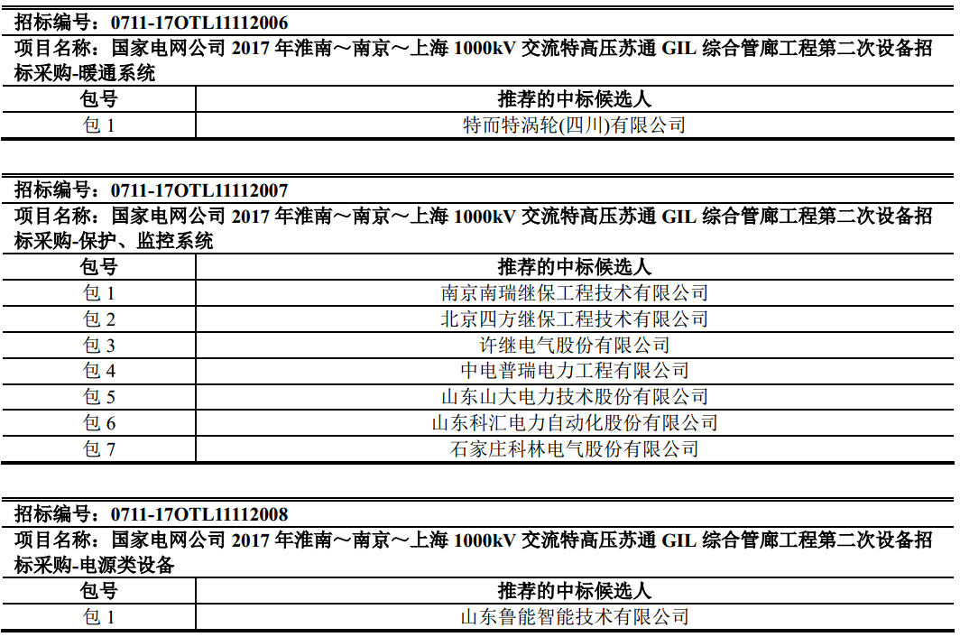 國網(wǎng)2017年淮南~南京~上海1000kV交流特高壓蘇通GIL綜合管廊工程第二次設(shè)備招標(biāo)中標(biāo)侯選人