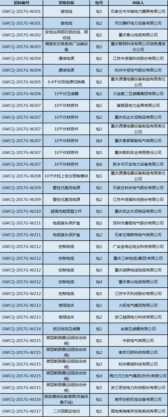 國網(wǎng)(重慶)2017年第三批協(xié)議庫存招標(biāo)中標(biāo)結(jié)果