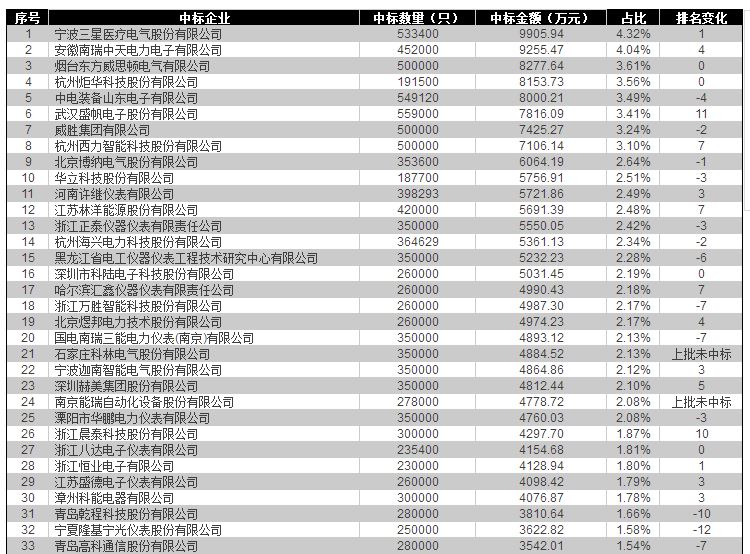 1.2017年第一次中標(biāo)企業(yè)中浙江正泰儀器儀表有限責(zé)任公司、杭州炬華科技股份有限公司、河南許繼儀表有限公司和華立科技股份有限公4公司未能在本批中標(biāo)。