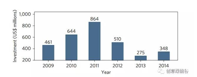 圖中全球企業(yè)和風險投資在能源存儲領域的投資。在金融危機后的2009年、2010年和2011年,投資水平在2014年大幅下降。
