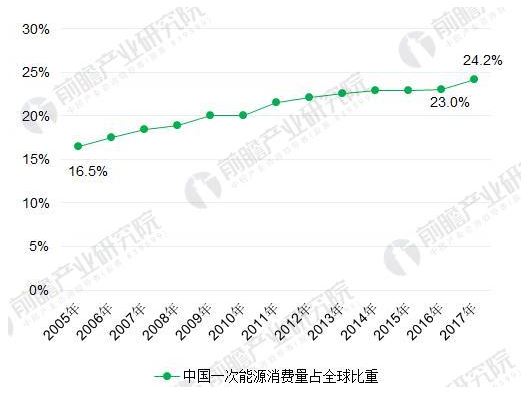 圖表6:2005-2017年中國大陸一次能源消費總量占全球比重變化(單位:%)